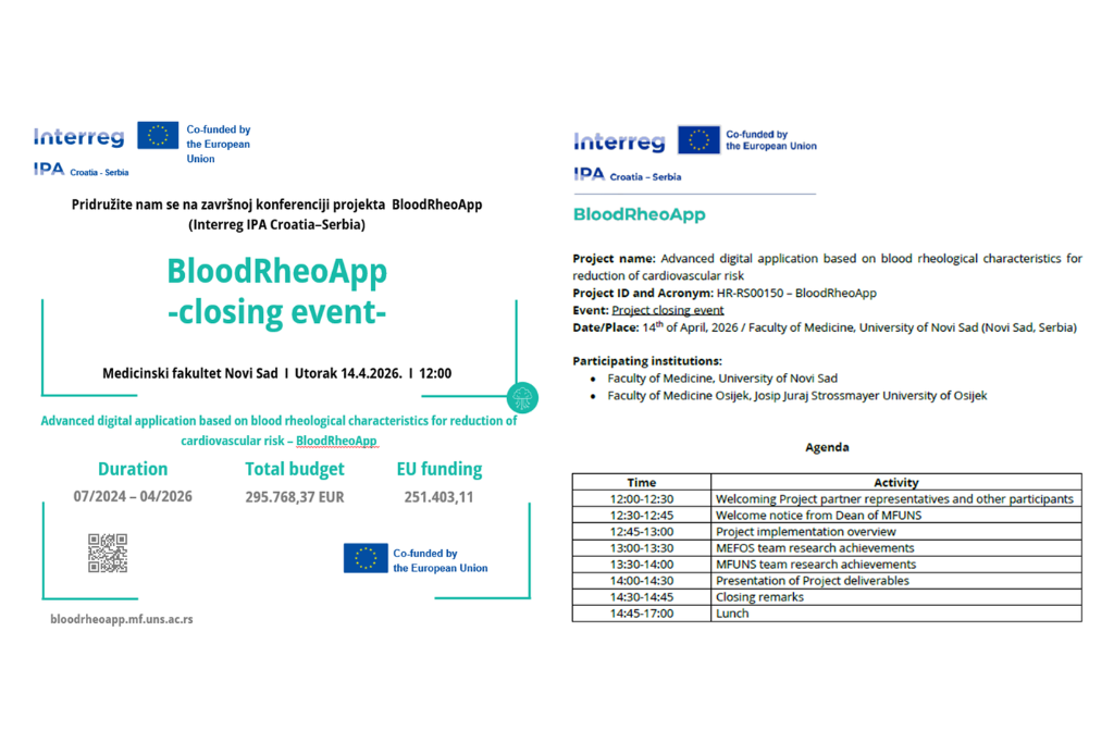 The BloodRheoApp Project closing event will be organized on 14 April, 2026 at the Faculty of Medicine Novi Sad (Hajduk Veljkova 3, 21 000 Novi Sad). The event will provide highlights of research achievements of MEFOS and MFUNS partners, project results, outputs and impact.